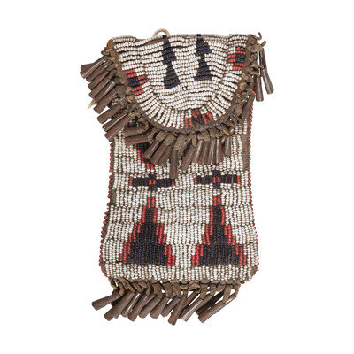 sinew-sewn commercial leather and beaded in colors of red white-heart, cobalt, and white; tin cone fringe