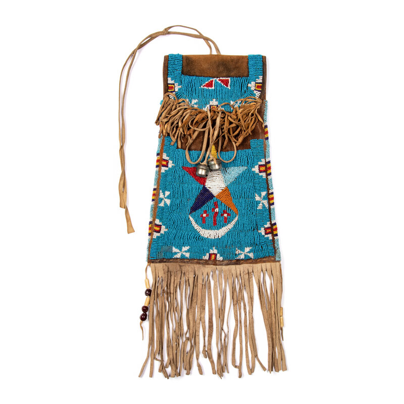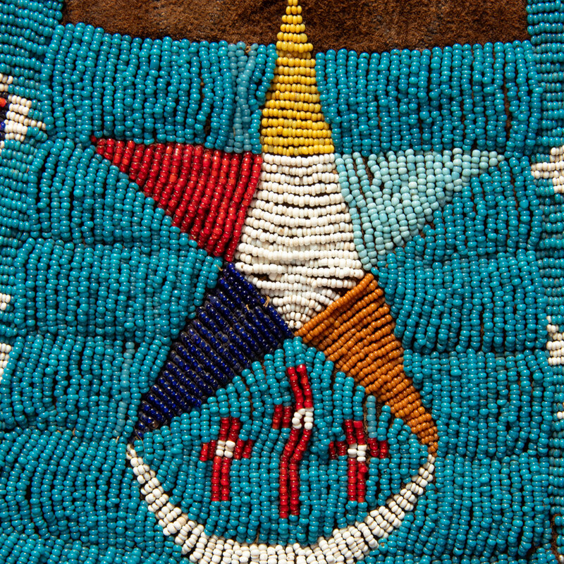 thread and sinew-sewn commercial and native tanned hides; designed with a star, crosses, and crescent moon