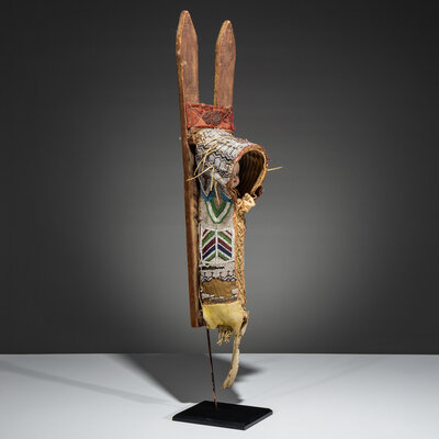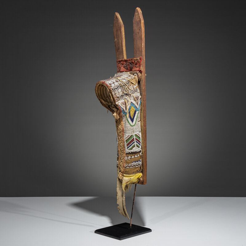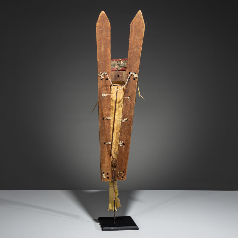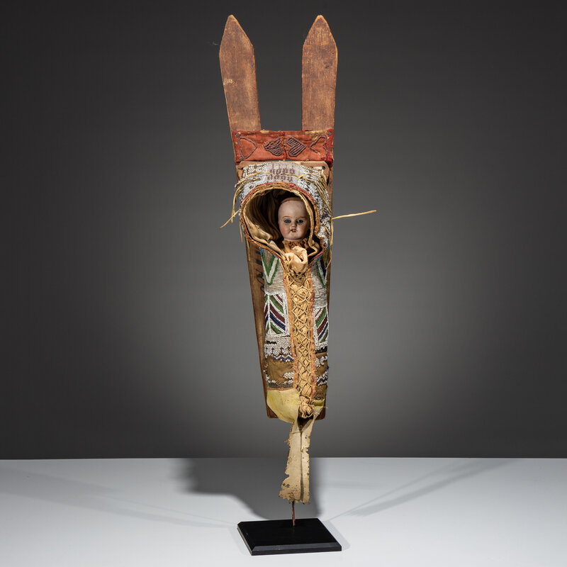 thread and sinew-sewn, softly tanned hide; beaded using a variety of techniques in colors of rose, pea green, white, dark blue, light blue, and cut brass; glass-eyed doll inside; remnants of yellow pigment on wood boards