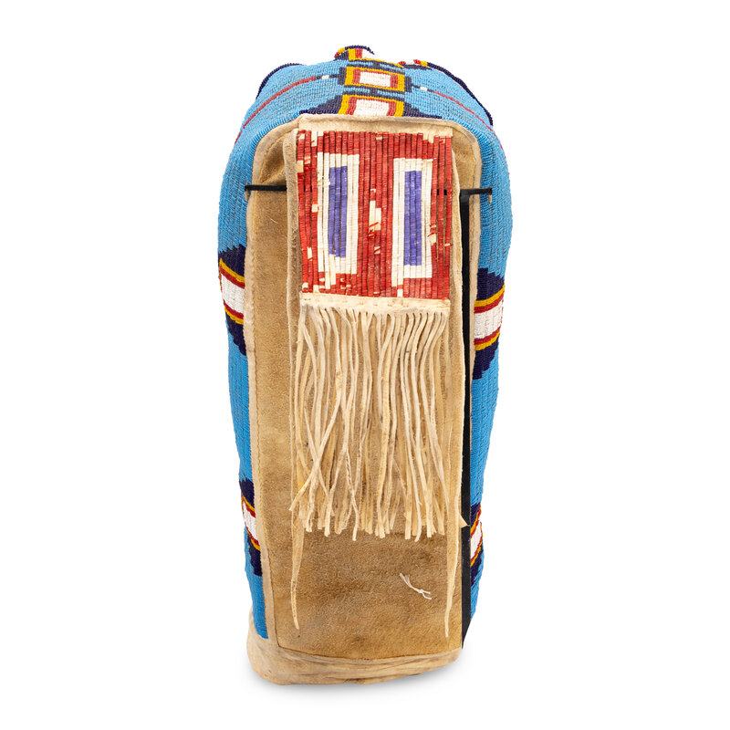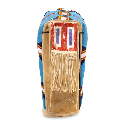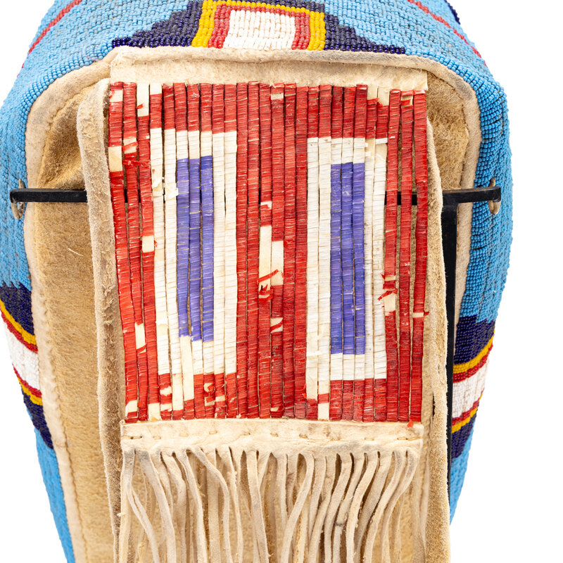 thread and sinew-sewn on commercially and Native-tanned hide; beaded in colors of light blue, red, yellow, dark blue, and white; quilled tab