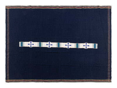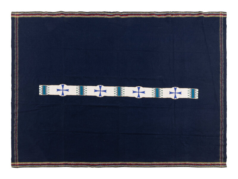 hide strip beaded in colors of white, greasy blue, dark blue, pale yellow, and green, is sewn to a navy trade blanket with rainbow selvage