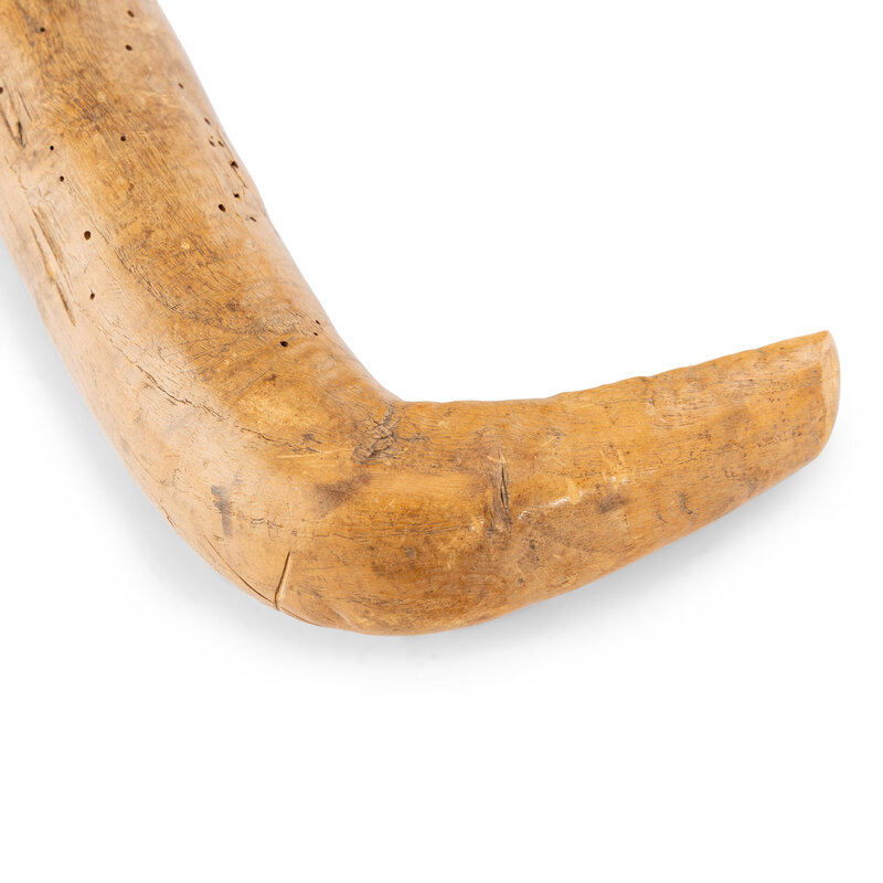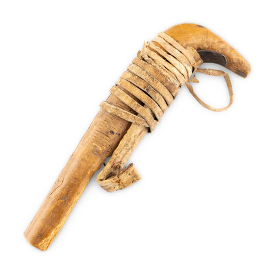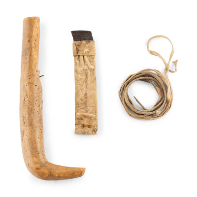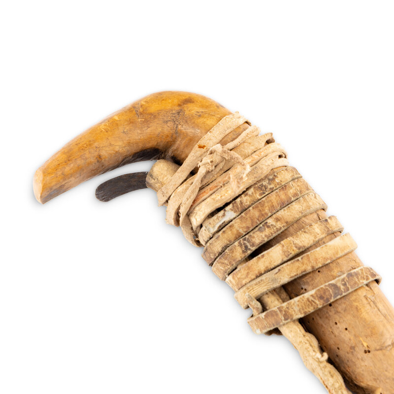 carved of wood and with 17 tally marks; handle wrapped with a thick hide thong capturing a bent file blade wrapped with hide and decorated with quillwork