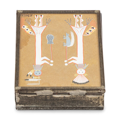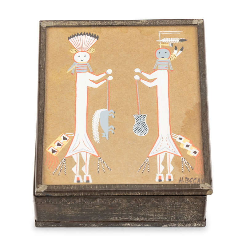 Around 1949, a Tucson-based interior decorator began incorporating small gouache paintings by Harrison Begay beneath glass as decorative inserts for cigarette and coffee-table boxes. The tinwork boxes themselves were fabricated by a local craftsman, creating a distinctive fusion of fine art and functional design characteristic of mid-century Southwestern interiors