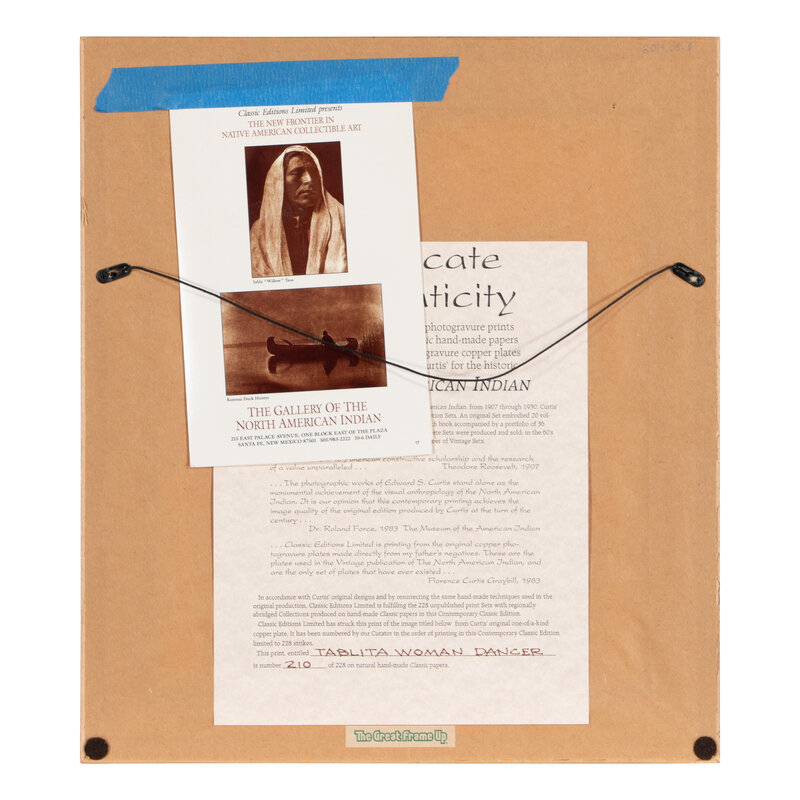 Limited edition, after a 1905 copyright photograph by E.S. Curtis. Printed ca late 20th century. With watermark and "210/228" handwritten at lower left.