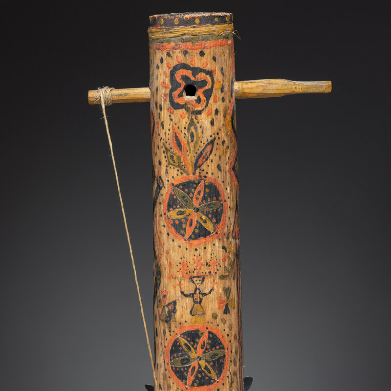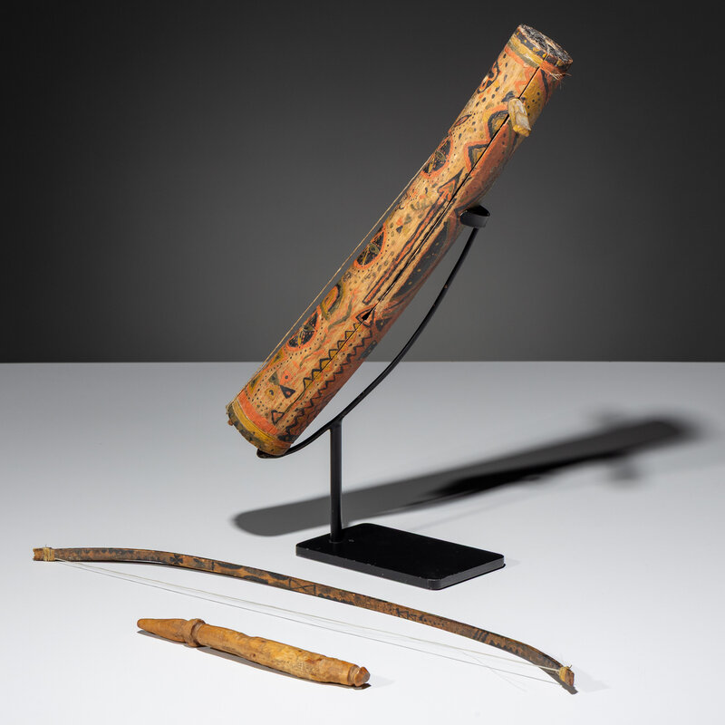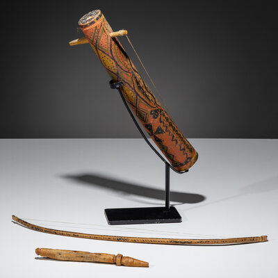 profusely painted with floral imagery, snakes, Mountain Spirits, and geometric elements; sinew string; with decorated bow