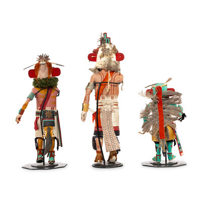 two Ogre katsinas, painted in teal; heights 10 inches and 14 inches
