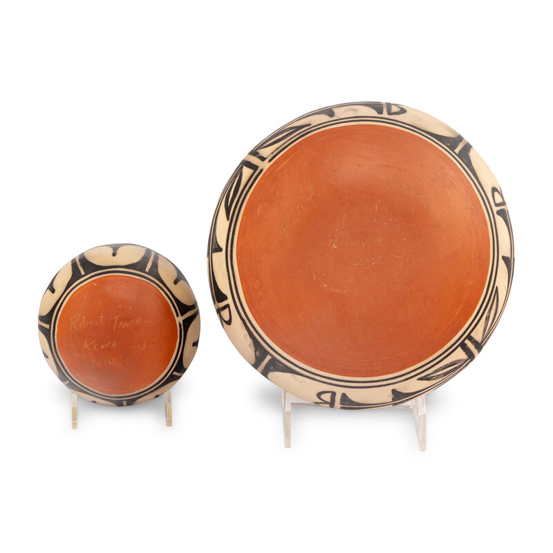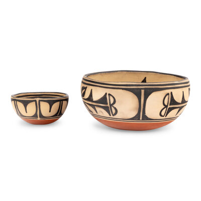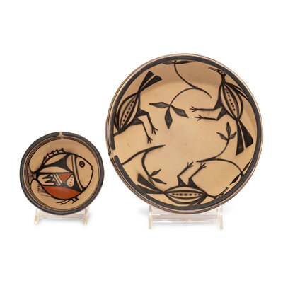 a larger example decorated with three birds on the interior and geometric floral designs on the exterior; height 4-1/4 inches x diameter 8-1/2 inches