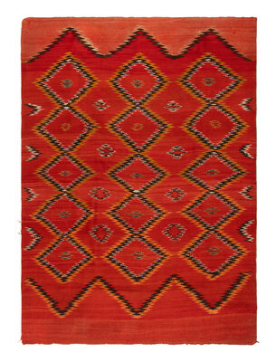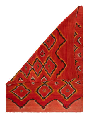 soft, handspun wool; woven with a repeating pattern of serrated diamonds in black, white, and orange against a red background