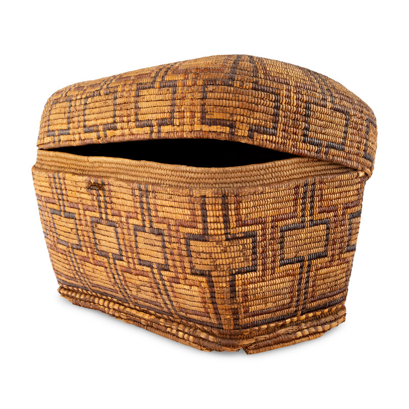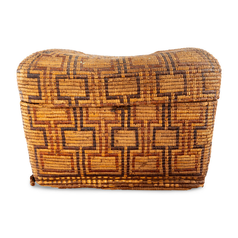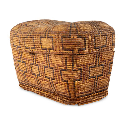 large, lidded basket with connecting rectangular elements; included is a typed note of provenance: Indian basket presented to Mrs. U.S. Greves by the wife of the Governor of Idaho