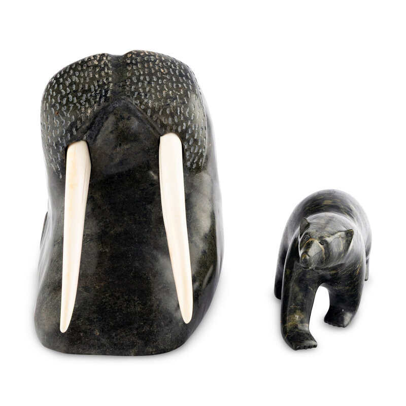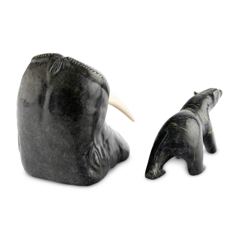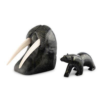 Inuit Carved Soapstone Walrus Head and Polar Bear