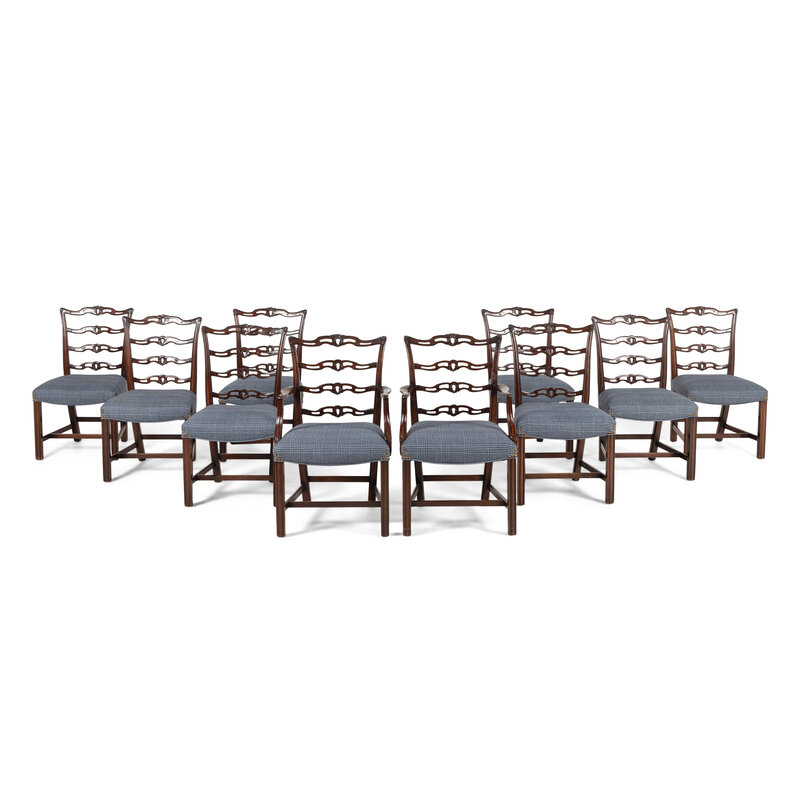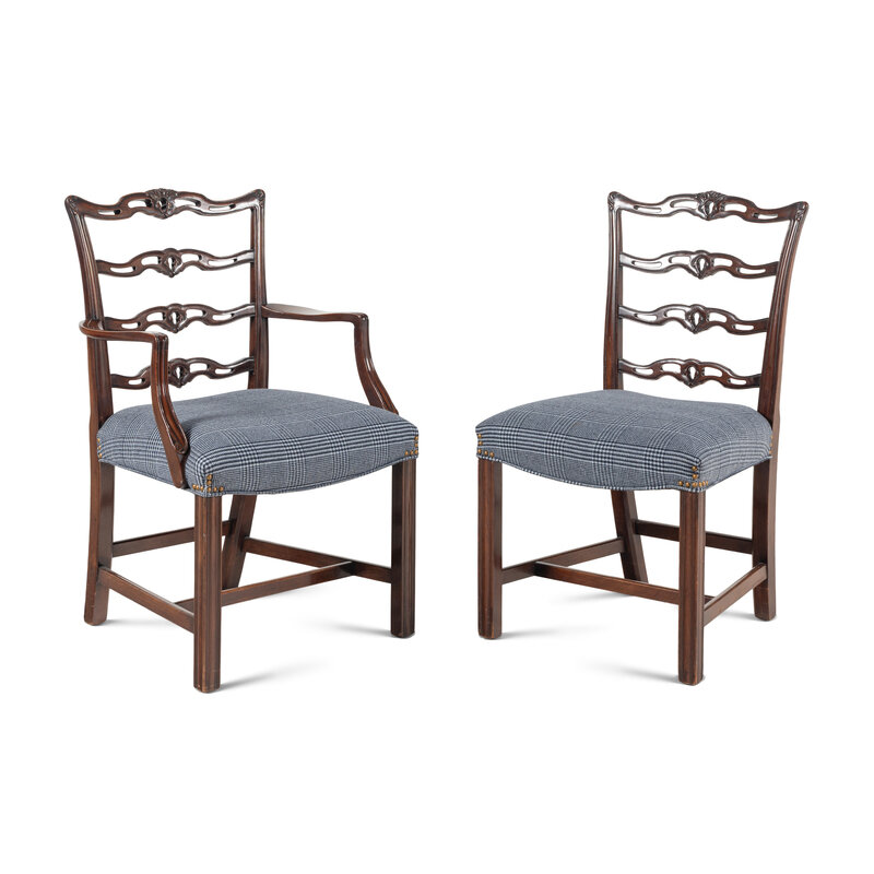 Height of armchair 37 x width 22 1/2 x depth 22 1/2 inches; height of side chairs 37 x width 21 1/2 x depth 21 inches.