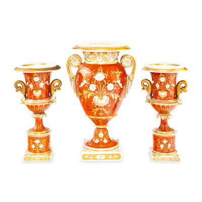A Worcester Porcelain Hand Painted and Parcel Gilt Three-Piece Urn Garniture