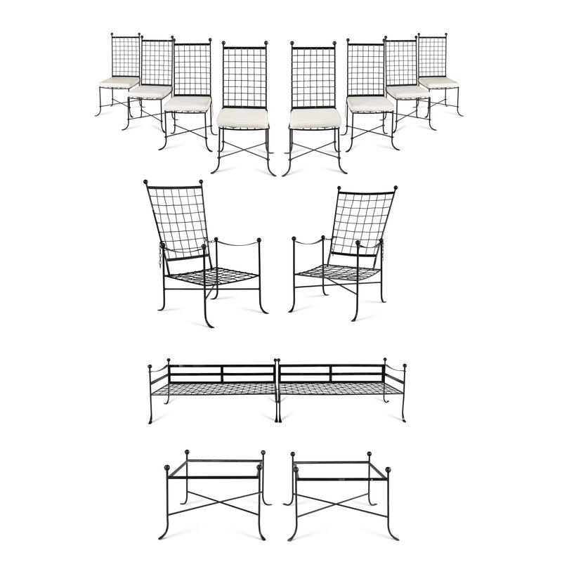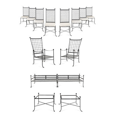 comprising eight side chairs, four reclining armchairs, one sofa, and two side tables; 15 total.