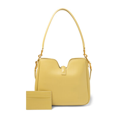 Small Camille 16 bag in pale yellow smooth calfskin leather. Turn-lock clasp closure, removable flat leather handle and removable flat leather strap.