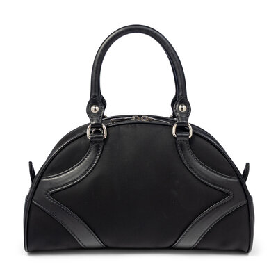 Small bowling bag in black nylon with black leather trim. Double zipper closure, rolled leather handles, and removable woven nylon strap.
