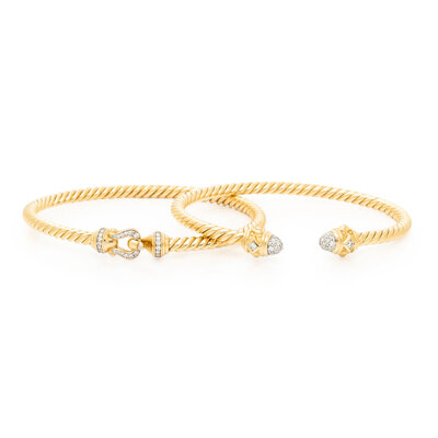Including a bangle bracelet set with round diamonds, semi-flexible with front closure, and a cuff bracelet set with round diamonds. 18 karat yellow gold. Each 6 inches and 5 3/4 inches inner circumference.