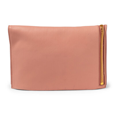 'Alix' flat zip tote bag in blush pink grained calfskin leather. Side exposed zipper closure with locking function; can be held with flat leather handle at top or as clutch, folded over.