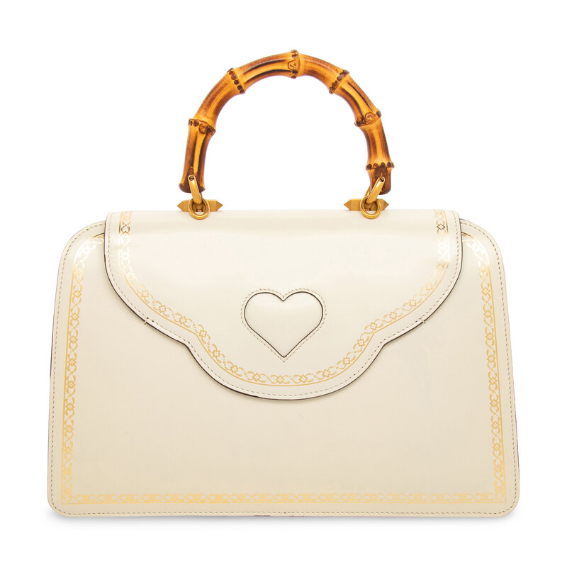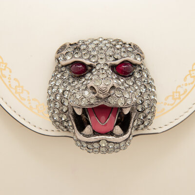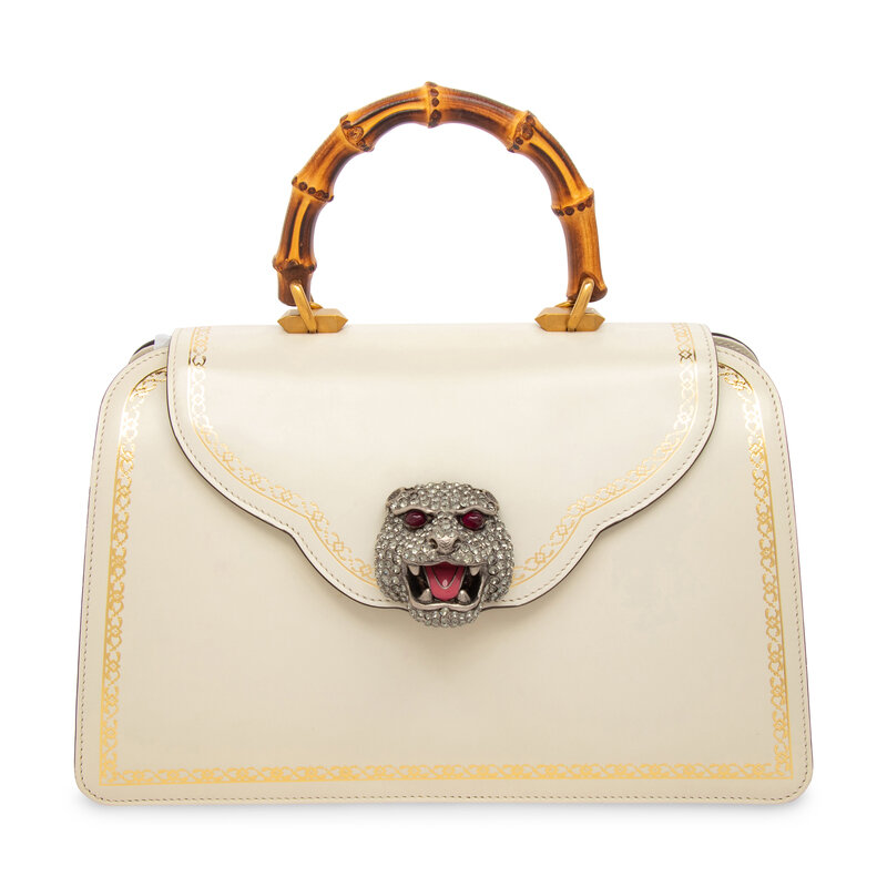 Thiara Bamboo bag in cream leather with gold-leaf detailing and metal crystal-embellished tiger head detail at flap. Push-lock closure to flap, bamboo handle, and removable chain strap.