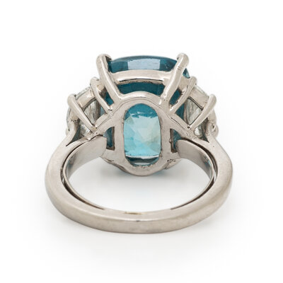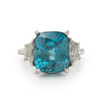 Cushion cut blue zircon weighing approximately 9.15 carats by formula, and half moon cut diamonds weighing approximately 1.00 carat total. Platinum. Ring size 4 1/4.