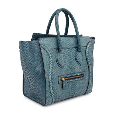 'Mini' Luggage bag in blue python skin. Zipper closure and rolled handles.
