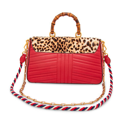 Jaguar Bamboo flap bag in jaguar-printed pony hair and quilted crimson leather. Push-lock closure, bamboo handle, removable metal chain and twisted cord straps.