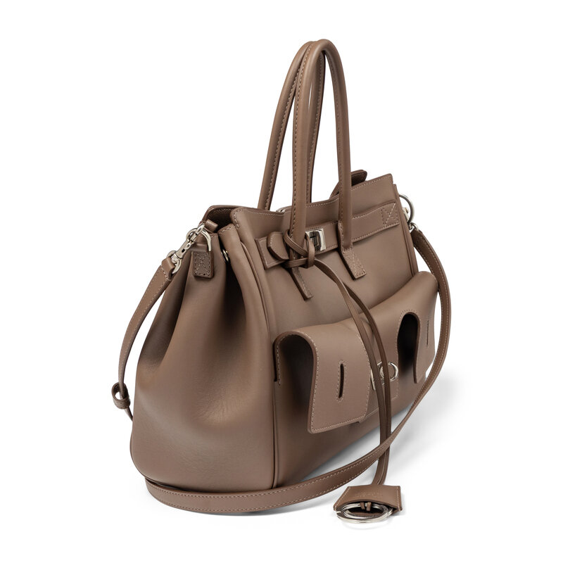 Small Bel Air Carry All in taupe calfskin leather with aged silver-tone hardware. Turn-lock closure, rolled leather handles and removable flat leather shoulder strap.