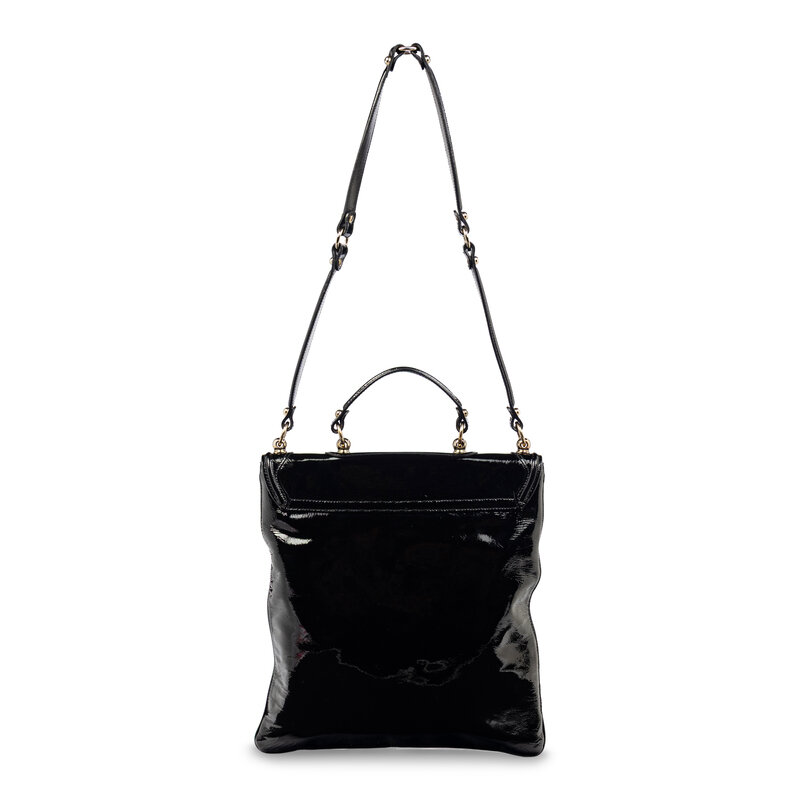 Britt Tote bag in black patent leather. Snap closure, flat leather handle, and flat leather shoulder strap.