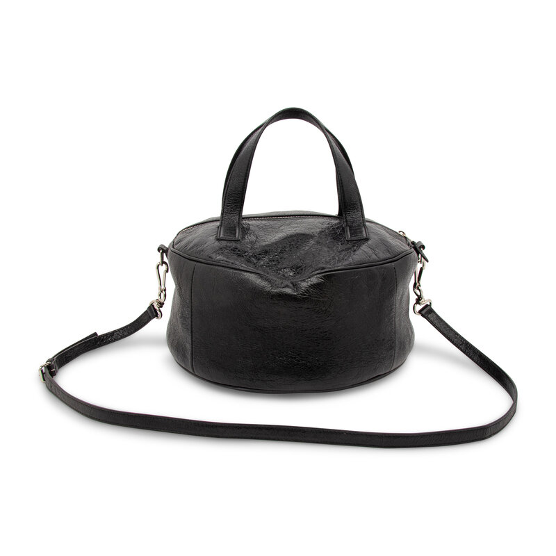 Circle bag in aged black leather. Zipper closure, flat leather handles, and removable flat leather shoulder strap.
