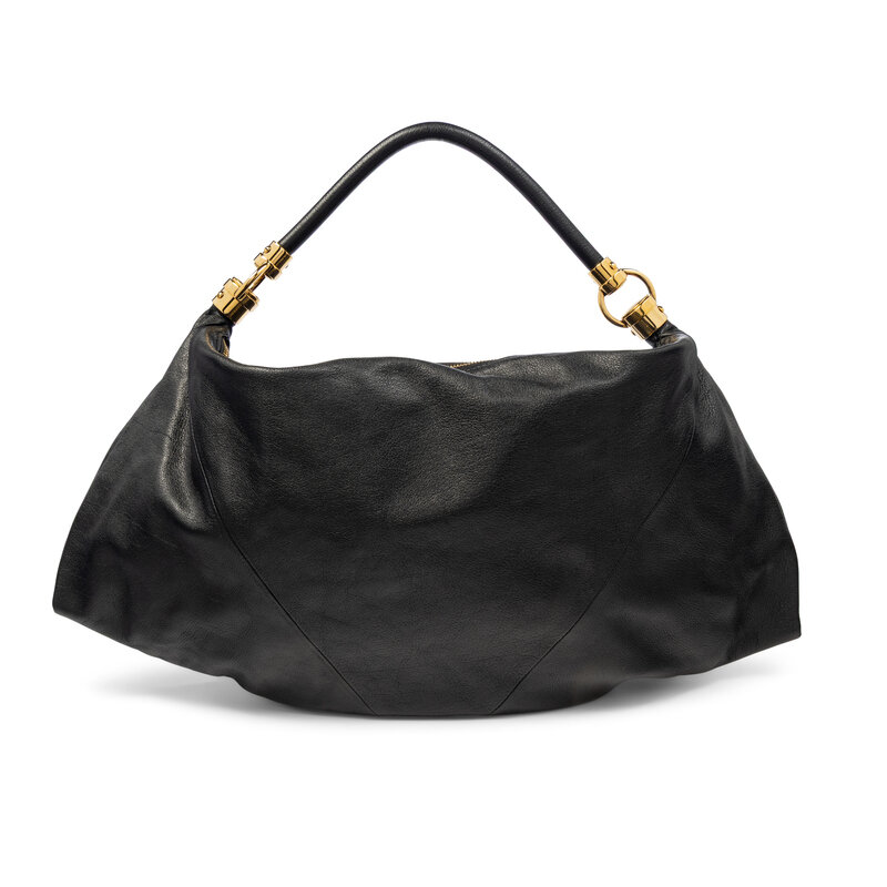 'Foulard' hobo bag in grained black calfskin leather. Zipper closure and rolled leather strap.