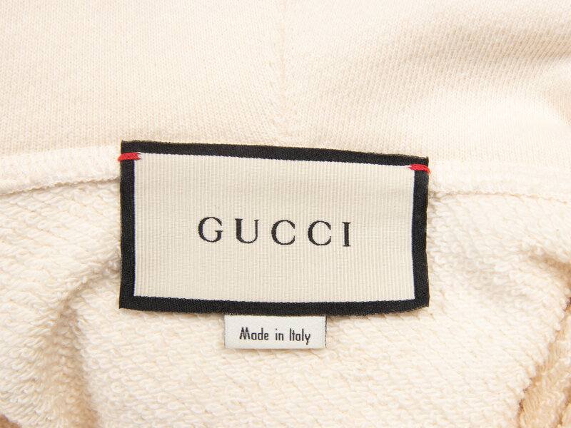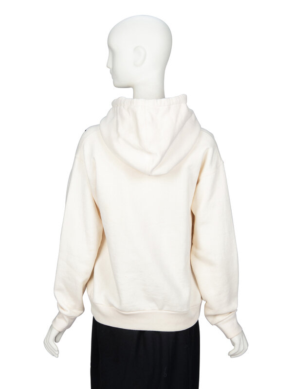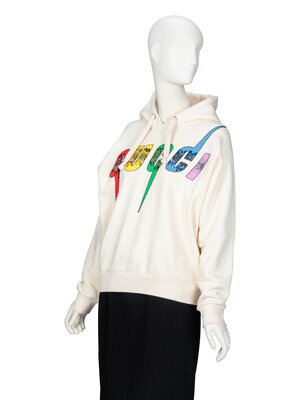 Hoodie in cream cotton French terry. Hood with tonal woven drawstrings. Dropped shoulder seams and full-length sleeves with ribbed knit cuffs. Painted Gucci logo with sequin & bead embellishments. Unlined.