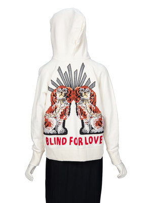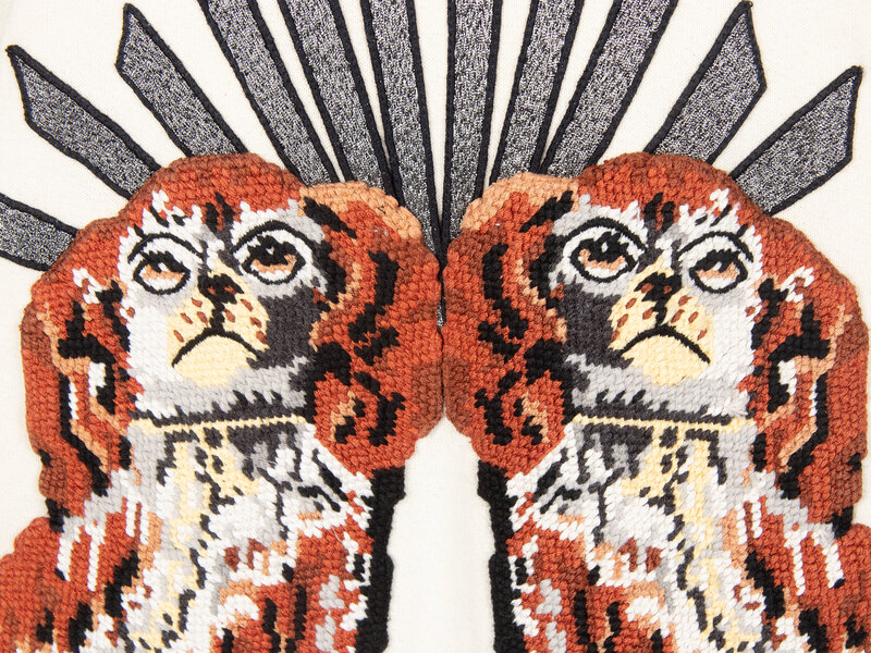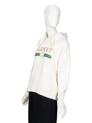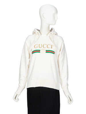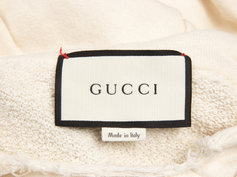 Lightly distressed hoodie in cream cotton French terry. Features Gucci logo print at front; and dog needlepoint appliques & embroidery at back. Hood at neckline with woven drawstrings; distressing at front neckline. Full-length raglan sleeves with ribbed trim at cuffs. Light distressing to edges of cuffs and hem. Unlined.