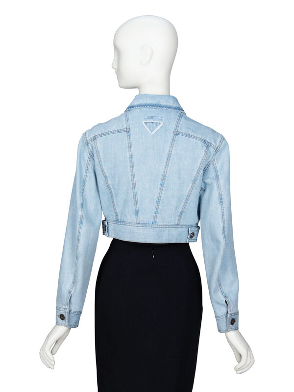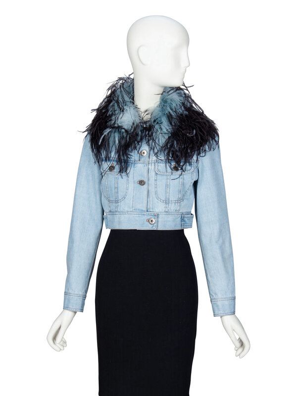 PRADA, FEATHER COLLAR CROP DENIM JACKET