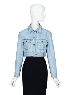 Cropped jacket in light wash cotton denim. Features a black & light blue-dyed ostrich feather removable collar; removable via interior snaps. Spread collar. Full-length sleeves with buttoned cuffs. Two buttoned-flap pockets at front. Button closures at front. Fully lined.