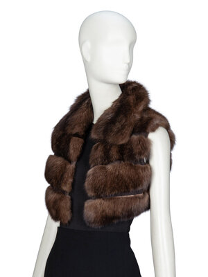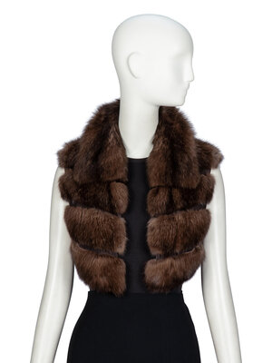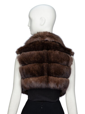 Cropped vest in brown sable fur and brown suede. Spread collar with brown snakeskin undercollar. No closures. Fully lined in brown cashmere jersey knit.