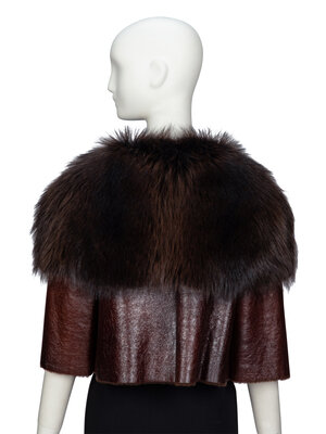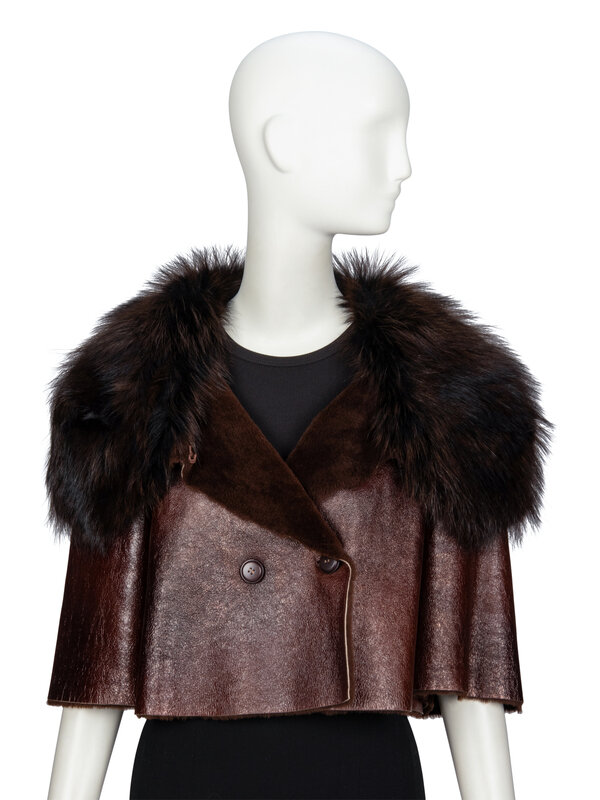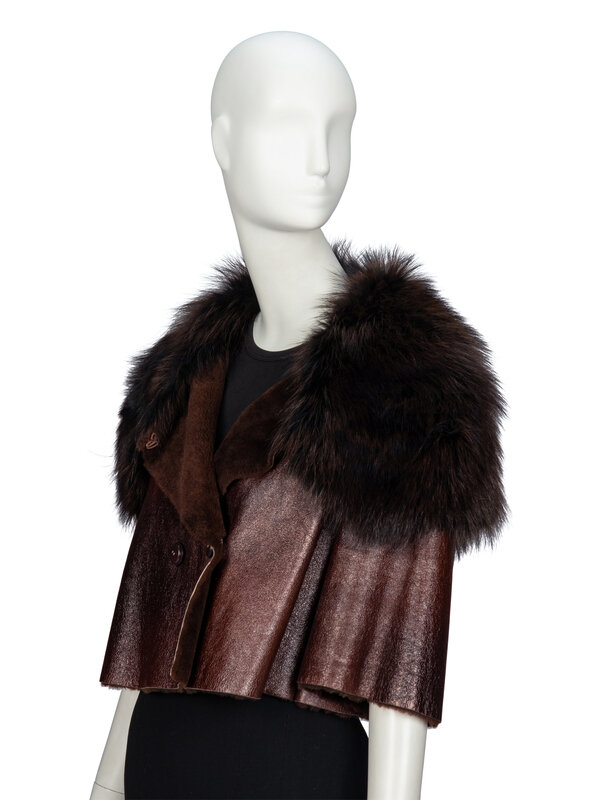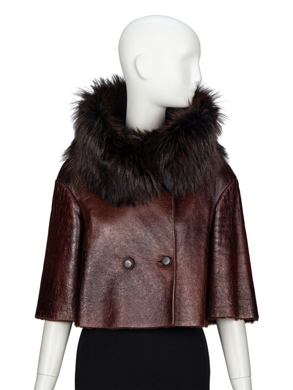 Cropped swing jacket in brown glossy lambskin leather. Large round brown raccoon fur collar. Elbow-length sleeves. Double breasted button closure at front; one hook-and-eye closure at neckline. Self-lined with brown lamb fur.
