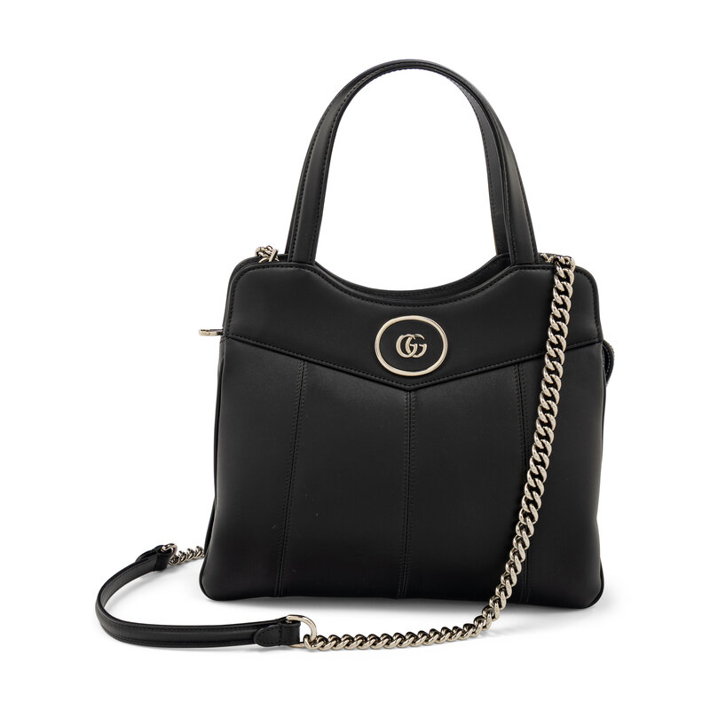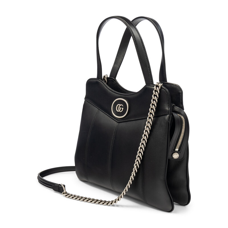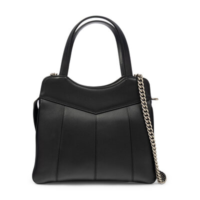 Tote bag in smooth black calfskin leather. Zipper closure, flat handles, and removable metal chain & leather strap.