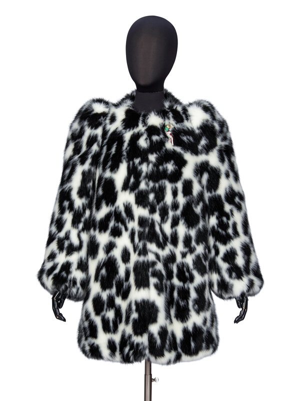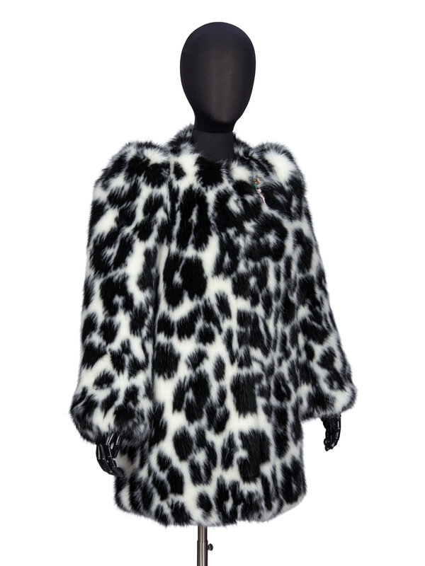 Hip-length coat in black & white leopard-print faux fur. Features attached rhinestone, metal, and enamel parrot pin near neckline. Round collarless neckline. Full-length sleeves with puffed shoulders. Two in-seam pockets at front. Four hook-and-eye closures at front. Fully lined.