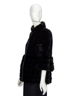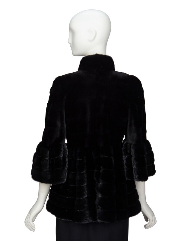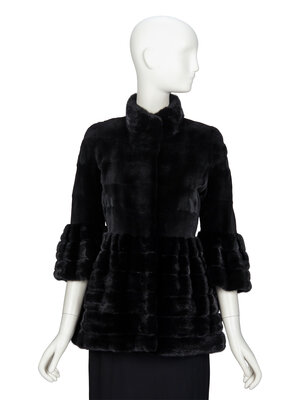 Hip-length coat in black dyed sheared & non-sheared mink fur. Stand collar. Elbow-length flared sleeves. Fitted bodice with flared skirt. Two slip pockets at front. Three snap closures at front. Fully lined in black cashmere jersey knit.