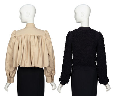 Cropped jacket in tan cotton gabardine. Stand collar with buttoned throat latch, Full-length sleeves with gathers and buttoned cuffs. Slight padding at shoulders. Two vertical welt pockets at front. Gathers at front & back yoke; bubbled hem. A-line bodice silhouette. Concealed button closures at front. Fully lined.