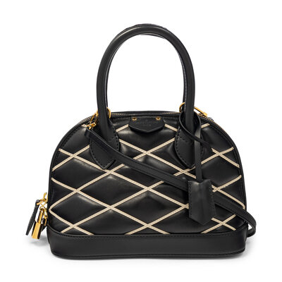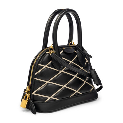 Alma BB bag in black lambskin leather with Mattelage contrast quilting. Locking double zipper closure, rolled leather handles, and removable flat leather shoulder strap.