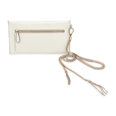 Wristlet/clutch in smooth polished white leather with silver-tone hardware. Turn-lock clasp closure and removable metal wrist strap.