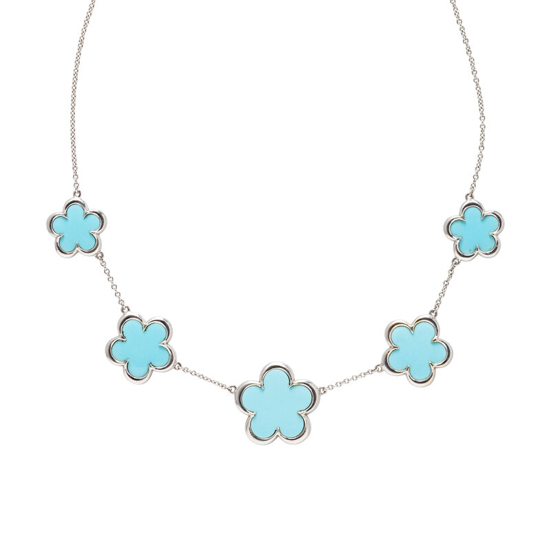 Blue hardstone flowers and round diamonds weighing approximately 0.70 carat total. 18 karat white gold. 14 5/8 - 16 1/2 inches long, with extender.