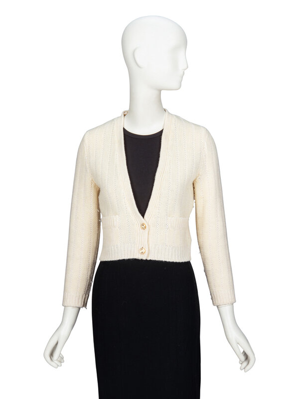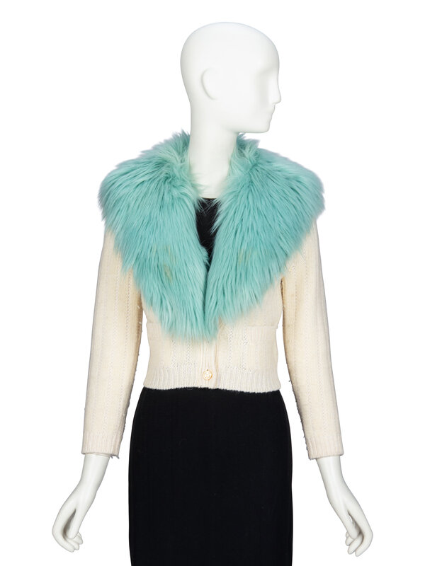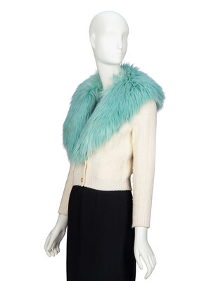 Cropped fitted cardigan in cream wool/cashmere-blend knit with a detachable teal faux-fur collar. V neckline. Full-length sleeves. Two welt pockets at front. Two button closures at front. Unlined.