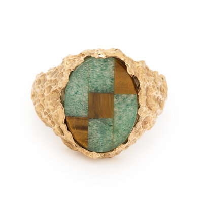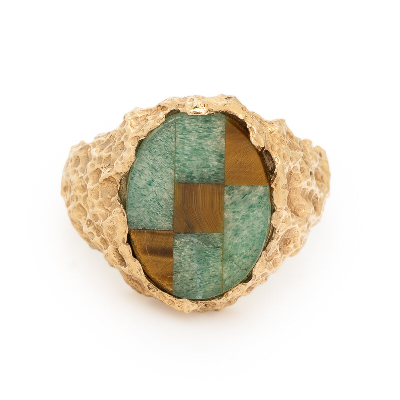 Inlaid aventurine quartz and tiger's eye. 14 karat yellow gold. Ring size 9 1/2.