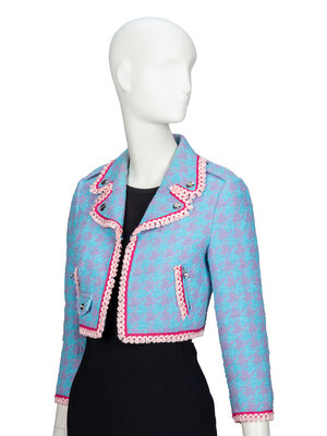 Moto-style crop jacket in blue & lilac bouclé houndstooth tweed with pink looped trim throughout. Notched collar & lapels with functioning metal snaps. Snap-buttoned epaulettes at shoulders. Wrist-length sleeves with zipper closures at sleeve hems. Two slanted zipper pockets at front; one decorative snap-buttoned pocket flap at front. Single hook-and-eye closure at front. Fully lined.