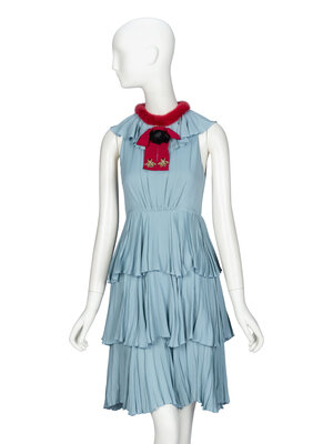 Sleeveless dress in softly pleated powder blue silk crêpe. Features red dyed marabou feather collar. Pleated Pierrot collar. Tiered knee-length pleated skirt. Removable burgundy petersham bow with bee embroideries and a faux rose at neckline. Invisible zipper closure at back. Fully lined.