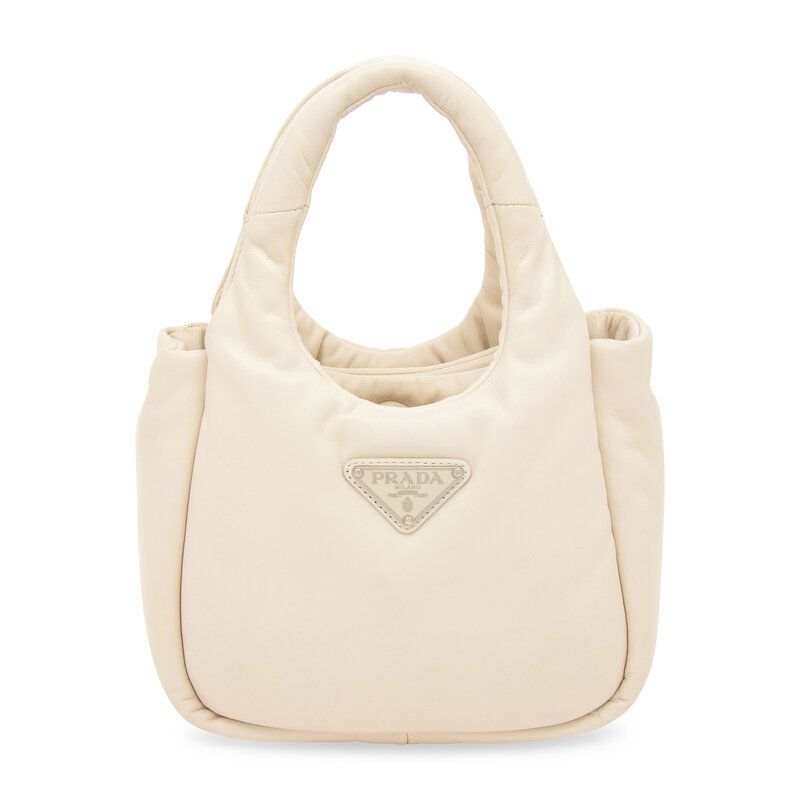 Small tote bag in padded off-white nappa leather. Magnetic snap closure; padded leather handles and removable & adjustable leather shoulder strap.