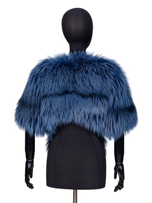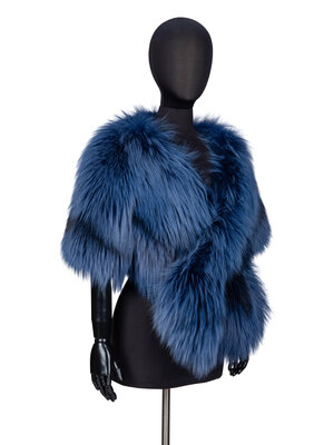 Cropped bolero jacket in blue-dyed fox fur. Collarless V neckline. Short sleeves. Extended front panels with cross-over threaded closure. Fully lined.