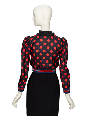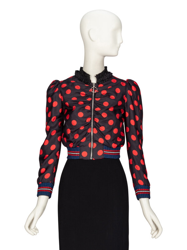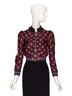 Cropped fitted jacket in black & red polka dot-print silk twill with striped metallic ribbed knit trim at hems. Stand collar with pleated black ribbon trim. Wrist-length sleeves with puffed shoulders. Ruching down front bodice. Zipper closure with large metal O-ring pull. Fully lined.