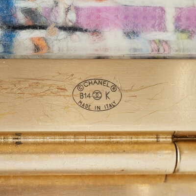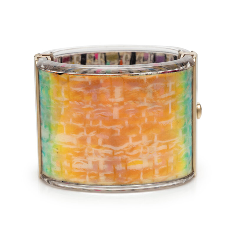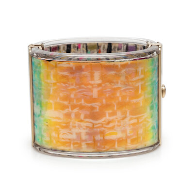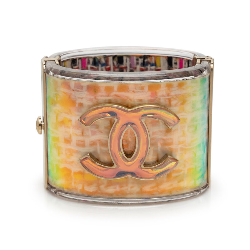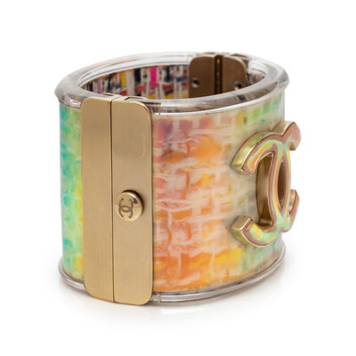 Logo cuff bracelet in a clear composite with a iridescent coating at exterior; multicolor tweed encased within. Gold-tone metal hardware. CC logo at exterior. Push-lock clasp closure and hinged opening. Stamped "Chanel / Made in Italy" at interior.